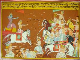 | Description / विवरण | Miniature painting based on Mahabharat - Virat parva depicting fighting between Arjun and Kripacharya with one arrow, he cut Kripacharya s bow, with another he distroy spear, then he distroy his armous and then many of his bows. he killed his horses, and chariots. Then he is laving the chariot and coming toward Arjun with Swords. |