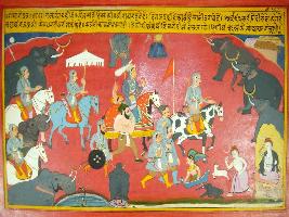 | Description / विवरण | Miniature painting based on Prithviraj Raso depicting army of king Panga marching to fight with king Prithviraj with his huge army. By seeing the march the earth and sky even the moon shakes in fear. |