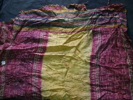 | Description / विवरण | This is a pure silk sari, with thick borders divided into three vertical colours, yellow in middle, and maroon colour. Sidewise including border. Torn off at various places. |