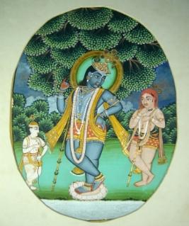 | Description / विवरण | Miniature painting depicting Krishna playing flute with two gopas in standing position. Sri Krishna is depicted standing upon a lotus. |