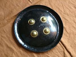 | Description / विवरण | Shield made of iron and it is of circular and concaved shape. Front side is coated with black colour, also four shaped, brass coloured knobs. In the back side is having a ring. |