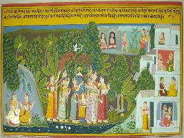 | Description / विवरण | Miniature painting based on Geet Govind depicting a scene from Vrindavan, Krishna is depicted doing Raas Lila with gopis and Radha, on the other side a village scene is depicted. |