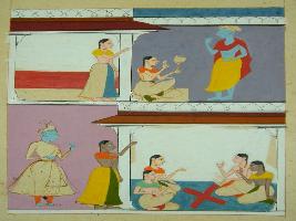 | Description / विवरण | Miniature painting based on Rasikpriya Probably depicting Krishna and Radha in the upper row, while in the lower part Krishna is arriving at Radha s palace, where she is playing games with her friends. |