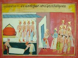 | Description / विवरण | Miniature painting based on Mahabharat - Udyam parva depicting Krishna coming in court with sages. king Dhritrashtra came outside and worship them. |