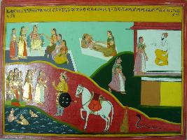 | Description / विवरण | Miniature painting based on Mahabharat - Adi parva. Devyani is depicted here with maid servants and she sends a sage towards a sage. A king is depicted standing on the bank of a river and talking to women. |