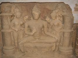 | Description / विवरण | An independent sculpture of a male deity, sitting in lalitasana on a cushioned pedestal, and flanked by two female attendants -one on each side. He is holding, probably a flower, in the right hand, raised to the chest and the left hand resting on the knee. He is wearing a Karand Mukuta , earrings, necklace, armlets, bracelets and girdle. The attendants standing, beside him are offering him something, which are rubbed out or mutilated. All the features are rubbed out. |