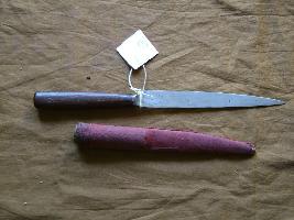| Description / विवरण | Knife made of stainless steel which is having a handle of wood. Blade is narrower towards tip. One edge is sharped. It is with scabbard which is made of wood and covered with red cloth. |