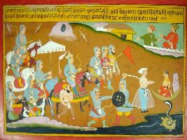 | Description / विवरण | Miniature painting based on Prithviraj Raso depicting Chandvardai talking to Earth goddess about her misery to bear the weight of all. At the right part, Prithviraj leading his army and marching forward. At upper left, two villagers are shown talking. |
