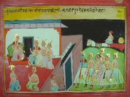 | Description / विवरण | Miniature painting based on Mahabharat - Udyam parva depicting Krishna steps down from his chriot and going inside the palace with Satyaki and Vidur. Inside the palace, king Dhritrashtra is sitting with Bishma, Dronacharaya, Kripacharaya, Duryodhan, Dushasana etc. |