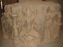 | Description / विवरण | An independent sculpture depicting a defaced deity probably Kubera, flanked by two female attendants, one of them is offering wine to him and other is holding the garland , On two extreme ends, two chanwar bearer are depicted holding chanwar, on the extreme left side there is also a depiction of another, female chanwar bearer. |