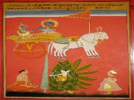 | Description / विवरण | Miniature painting based on Shri Bhagwat Gita. It depicts that Shri Krishna is telling Arjun that the saint who doesn t care about his wants of body, and doesn t show anger gets the earthy joy. |