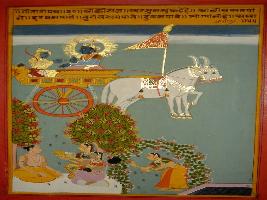 | Description / विवरण | Miniature painting based on Shri Bhagwat Gita depicting Krishna tells Arjun that a person in good spring gets joy and in bad spring gets sad is intelligent person. |
