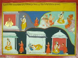 | Description / विवरण | Miniature painting based on Mahabharat - Adi parva. Shukracharya is depicted talking to Devyani, he then is depicted talking with some people and demons Shukracharya is then depicted talking to a man sleeping. |