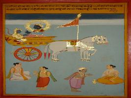 | Description / विवरण | Miniature painting based on Shri Bhagwat Gita depicting preaching of Gita by Krishna to Arjun and Krishna depicted saying that in whose heart god is present he is equal to Brahma. |