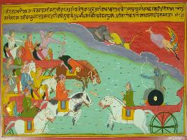 | Description / विवरण | Miniature painting based on Mahabharat - Virat parva depicting Virat yudha. Arjun is depicted fighting alone with Kauravas, Kauravas seems like tiger in front of elephant and snake in front of Garuda. |