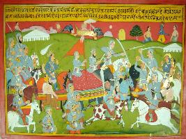| Description / विवरण | Miniature painting based on Prithviraj Raso depicting war scene between army of Panga and army of Prithviraj. Sanjogita is shown sitting on horseback with Prithviraj. At the upper level Ravan is shown in a yaan with Apsaras on both side of yaan, Ravan is depicted compare with army of Panga. At the upper left part, Krishna is shown sitting. |