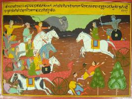 | Description / विवरण | Miniature painting based on Mahabharat - Virat parva depicting fighting with Kauravas alone, he is one arrow beheaded Vikarm. |