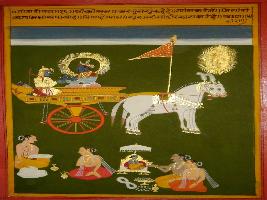 | Description / विवरण | Miniature painting based on Shri Bhagwat Gita depicting Krishna preaching knowledge of Gita to Arjun and says to Arjun knowledge ends ignorance, and knowledge is like the light of the sun. |