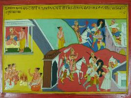 | Description / विवरण | Miniature painting based on Mahabharat - Adi parva. The painting depicts a king who made many Digavijaya and in last went to vana for worshipping. |