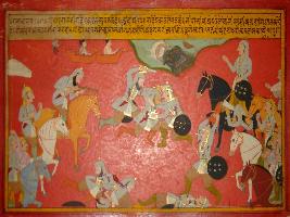 | Description / विवरण | Miniature painting based on Prithviraj Raso depicting war between Prithviraj s army and Ghauri s army. It also depicts Goyand Rai fighting with Meer and beating him as elephant beats cows. |