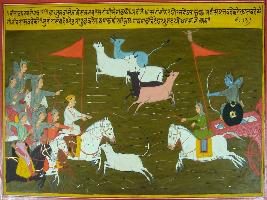 | Description / विवरण | Miniature painting based on Mahabharat - Virat parva. The painting depicts that Arjun is cluking the Gandhiv and asked Uttar to go towards Duryodhan to recover the cattles while other Kuravas are seen in fighting seen. |