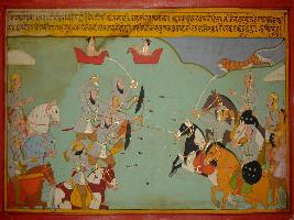 | Description / विवरण | Miniature painting based on Prithviraj Raso depicting war between armies of Prithviraj and king Panga depicting death of Goyand Rai and Prithviraj coming running with sword in hand as leopard is running. |