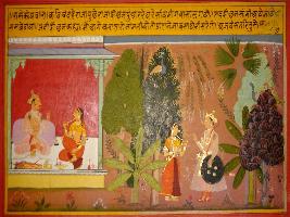 | Description / विवरण | Miniature painting based on Prithviraj Raso. After talking to Chandvardai the king goes to the house of Icchani to take blessing. Then Icchani gives him seat and says it is the spring season. |