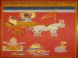 | Description / विवरण | Miniature painting based on Shri Bhagwat Gita depicting Krishna preaching the knowledge of Gita to Arjun and says man should do all duties. |