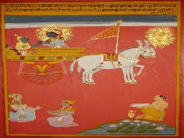 | Description / विवरण | Miniature painting based on Shri Bhagwat Gita depicting Krishna preaching Arjun the knowledge of Gita, Krishna preaching Arjun that one who meditates daily attains the knowledge of the five elements of human composition. |