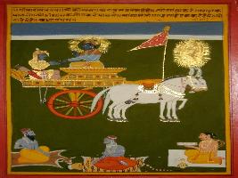 | Description / विवरण | Miniature painting based on Shri Bhagwat Gita depicting Krishna preaching Arjun knowledge of Gita. |