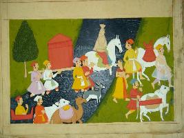 | Description / विवरण | An incomplete painting of a royal procession, where the king is seen on horse back and four men carrying a palanquin by his side. The painting depicts the procession crossing a river. |