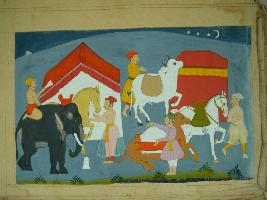 | Description / विवरण | An incomplete painting of a royal procession depicting five men with elephant, horses, camel and a bull. The procession is resting for the night. |