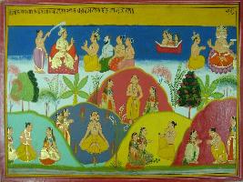 | Description / विवरण | Miniature painting based on Mahabharat - Adi parva. It depicts Indra sitting with various sages and a king. A sage is depicted with his wife on the top. Brahma is depicted with a king. |