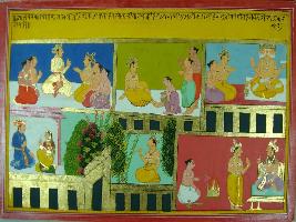 | Description / विवरण | Miniature painting based on Mahabharat - Adi parva. On the upper part Indra is depicted sitting with five sages, a sage is depicted washing feet of a king. Brahma is depicted with a king and a sage. On the lower part a couple is depicted sitting a king is depicted sitting alone and performing yagna. |