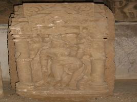 | Description / विवरण | An independent sculpture of a standing female chanwari bearer in niche. The figure s right hand lying parallel to her body and left hand holding the chanwari which seems towards the right side of her head. She is adorned with jewels like necklace, girdle, garland and tussels. At her extreme right and left there are two pillar having amlak design on it. On the upper front side of the pillar floral designs are seen. |