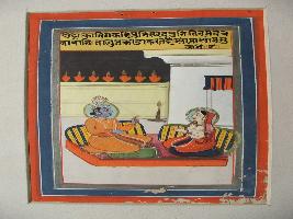 | Description / विवरण | Doha is written on top related to Kartik month. Radha and Krishna are shown besides masand bolster talking to each other. |