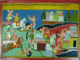 | Description / विवरण | Miniature painting based on Mahabharat - Adi parva depicting Dhritrashtra refuses to give state to Yudhisthir and Pandavas fighting with enemies. |