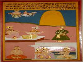 | Description / विवरण | Miniature painting based on Sarangadhar depicting Sun s chariot on the top of the painting, below it two men are seated and talking with each other and another person standing near them, while on the lower part of the painting a sage doing penance and on its left a king is seen seated with two people. |
