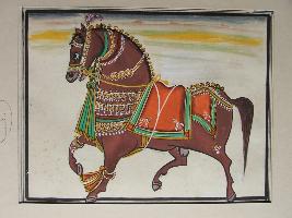 | Description / विवरण | It is a painting of brown ochre horse. It is shown at white paper. The horse is ornamental decorated. It is in running form. Briddle is shown. |