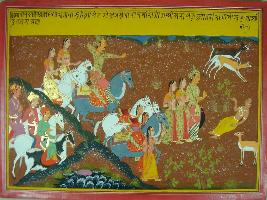 | Description / विवरण | Miniature painting based on Mahabharat - Adi parva depicting that king Pandu is in vana with his two queen and he killed a sage who won a form of deer in loving union. On the painting depicts above mentioned story and the follower of king is seen in the lower left side. |