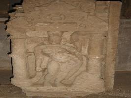 | Description / विवरण | An independent sculpture of a female chanwari bearer which is in a standing position in the niche. The figures right hand is lying parallel to her body and left hand is holding the chanwari which seems towards the right of her head. She is adorned with jewels like necklace, girdle, tussels and garland. There are two amlak design pillar in the both side of the chanwari bearer. Above the figure there is the depiction of floral designs. |