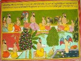 | Description / विवरण | Miniature painting based on Harivansha depicting a story where Rishi Mudgal is sitting with a boy backed by Manaka in the upper row, while in the lower it depicts from right side . Rishi is sitting with the some person than again the Rishi is seen in the middle that saying something to two bay and in the extreme lower right side it depicts Menaka taking bath in the pond. |