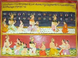 | Description / विवरण | Miniature painting based on Harivansha depicting with his wife sitting with his son Susanti, at upper right. To its left, king Susanti sitting with his son Purjati, to its left, Purjati is sitting with his son Bajash. At the lower right part, king Bajash is sitting with his 5 sons, out of which eldest s name is Mudhgal. king Mudhgal sitting with Mudhgal. At the extreme lower left, three sages is shown sitting. |