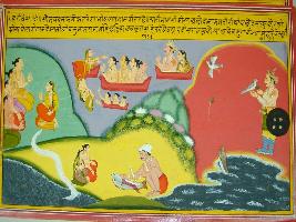 | Description / विवरण | Miniature painting based on Harivansha depicting the story of Sumyada. She is sitting and talking to some sages in the right side and also seen on viman with them. She loses her finger ring, which fell in to the sea, a fishermen retrieves it in a fish. In the left side a king is seen with a bird. |