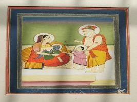 | Description / विवरण | Nand Baba is shown in white beard. Krishna is sitting in laps of yashoda. Balram is standing near Nand. Top part of paintings is shown blue sky scene . |
