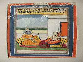 | Description / विवरण | Doha poetry is written on top. Radha and Krishna are conversing with posture. Radha is sitting besides masand bolster . |
