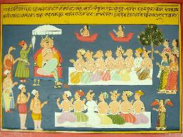 | Description / विवरण | Miniature painting based on Mahabharat - Gada parva depicting coronation ceremony of Skanda as a commander in chief of gods such as Sanka, Karna, NiKarna, Padma, Kumuda, Ananda, Kahama, Apa Kahama, Kapi, Skanda, Jaldhma Akshma, Sahasrabahu, Ajodhara, Gajasir, Satalochan etc and Gandharava and apsaras came for ceremony. Kartik was given name Yodhara. Kartik is shown sitting on couch with male chori bearer. And he is surrounded by god, Gandharvas and Apsaras. Some of them sitting intwo lines and some standing looking at him. |