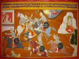 | Description / विवरण | Miniature painting based on Prithviraj Raso depicting war between Langri Rai and Samant Pradhan. Samant Pradhan threw spear on Langri Rai and Langri Rai cut the head of Samant Pradhan and Mahadev collected the head to make a garland of heads. |