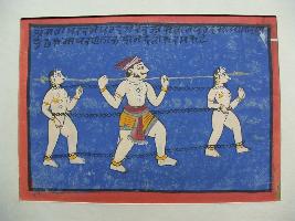 | Description / विवरण | It is a blue colour painting in which two woman are . Both lady is shown wearing ornament in rose and bracelsss in armed red turban is shown on male, head. At top writing is shown. |