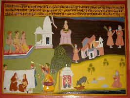 | Description / विवरण | Miniature painting based on Sanskrit drama Malti Madhav depicting Kamandiki asking Avlokita that who told her about penance of Saudamini. Then avlokita told her that there is a female aGhauri named Chamunda in the crematorium near the city, told her about the penance. |
